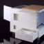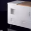 Cuisine monobloc bois et Corian montée sur chariot avec plaque à induction, réfrigérateur, tiroirs, placard, prises de courant, planche à découper et plan de travail extractible ("Minikitchen", Boffi).