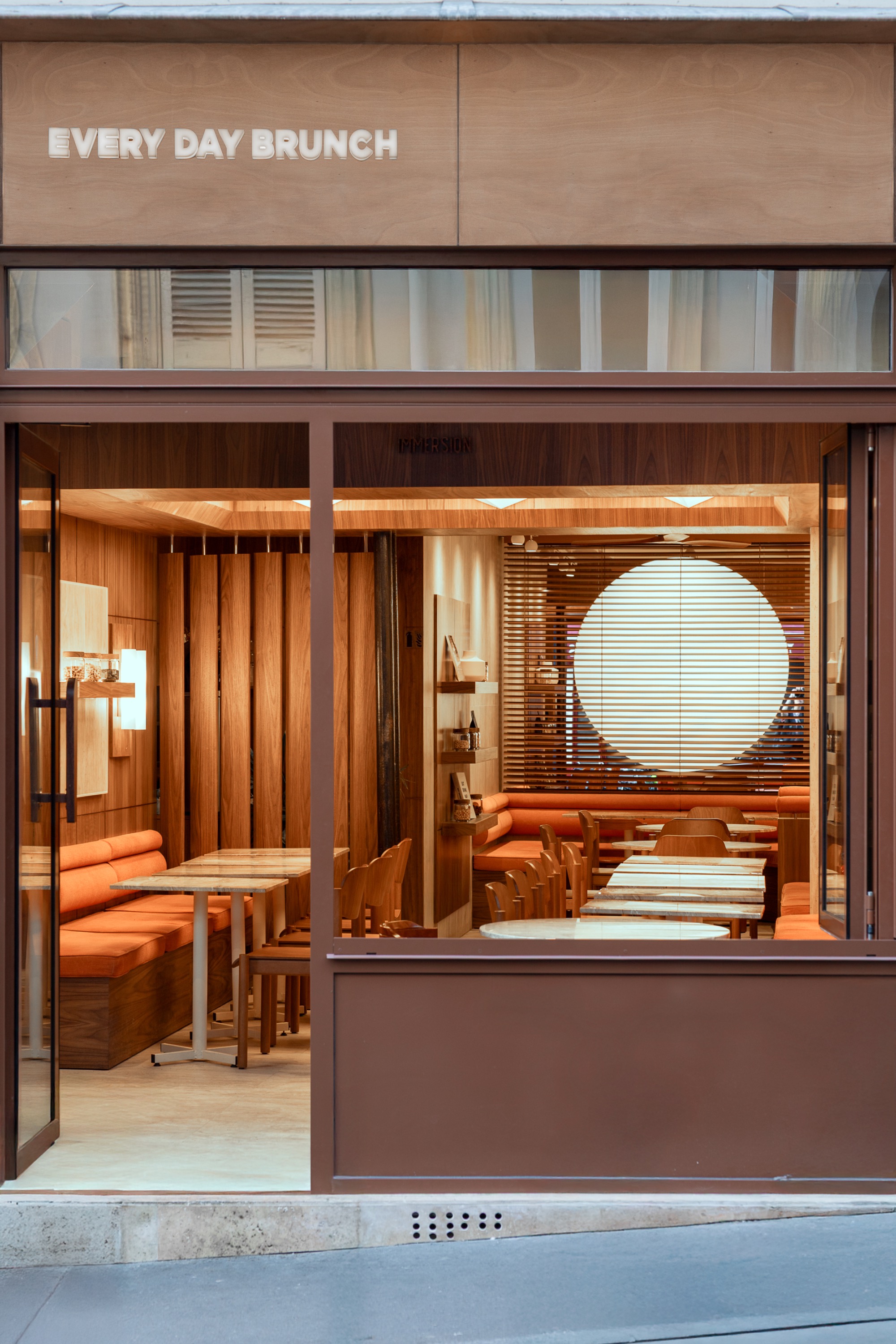 Dans un Montmartre animé, en haut de la rue des Martyrs, le coffee shop Immersion dévoile un décor pensé comme un écrin futuriste aux accents rétro. Confiée au Studio Louis Morgan, l’espace de 60 m2 joue des contrastes, entre matières brutes et touches pop. Au centre de cette scénographie, une décoration murale pensée comme un soleil lumineux en lévitation. Visible depuis l’extérieur de l’établissement, “l’idée était de proposer un élément très fort au fond du local qui intrigue et attire les clients vers la pièce du fond”, confie Louis Aspar, fondateur du Studio Louis Morgan.
