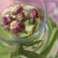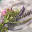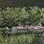 Table dressée sous une voûte de roses pour un tartare de concombre et saint-jacques à servir frais. Coupelles aux couleurs pastel (Christiane Perrochon), cuillères (Alinéa), nappe en lin et chemin de table rose tendre ou vert tilleul (Maison Fassier).