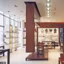 Merisier et surfaces claires traitées en Corian dans les espaces shopping.