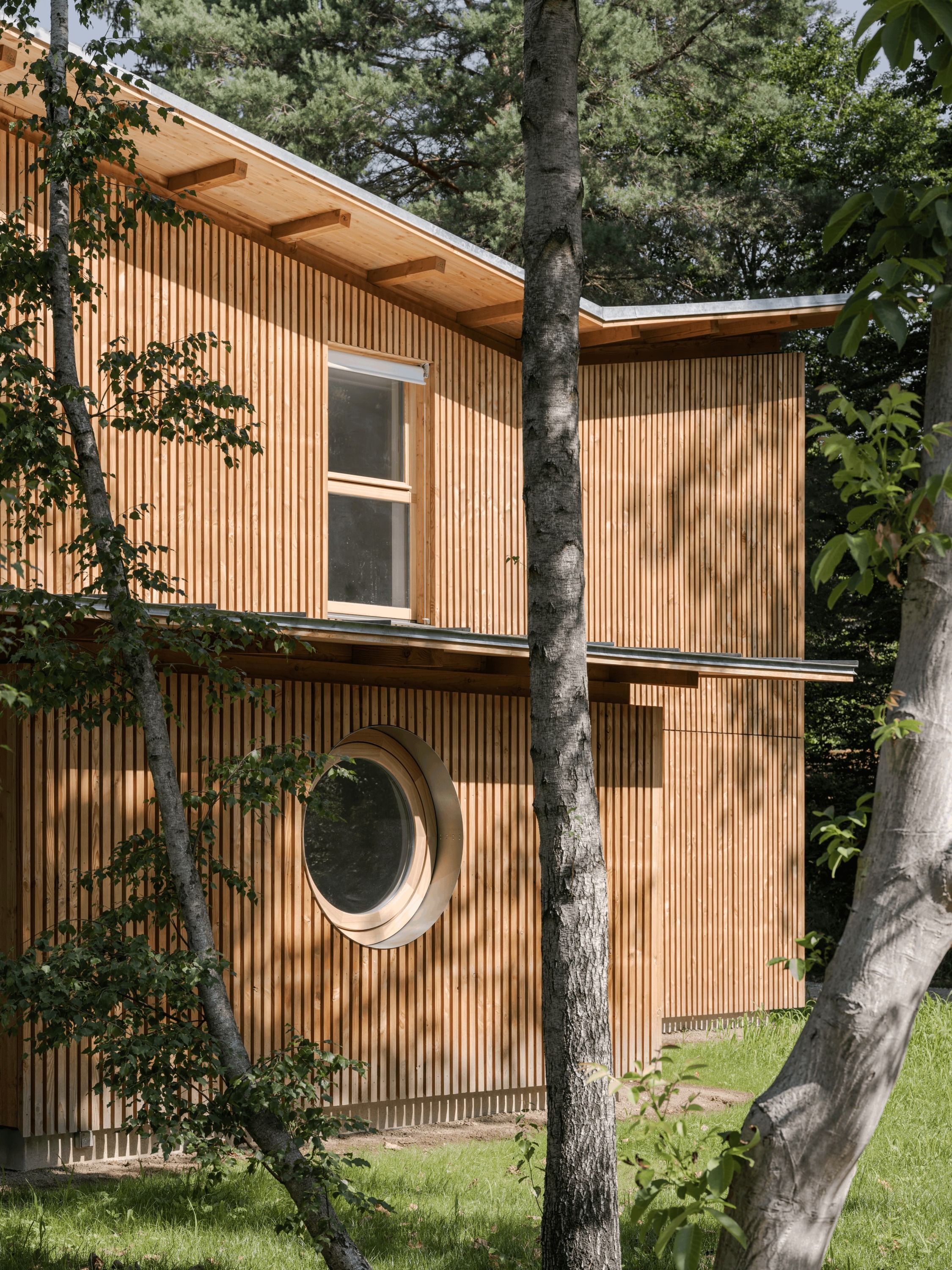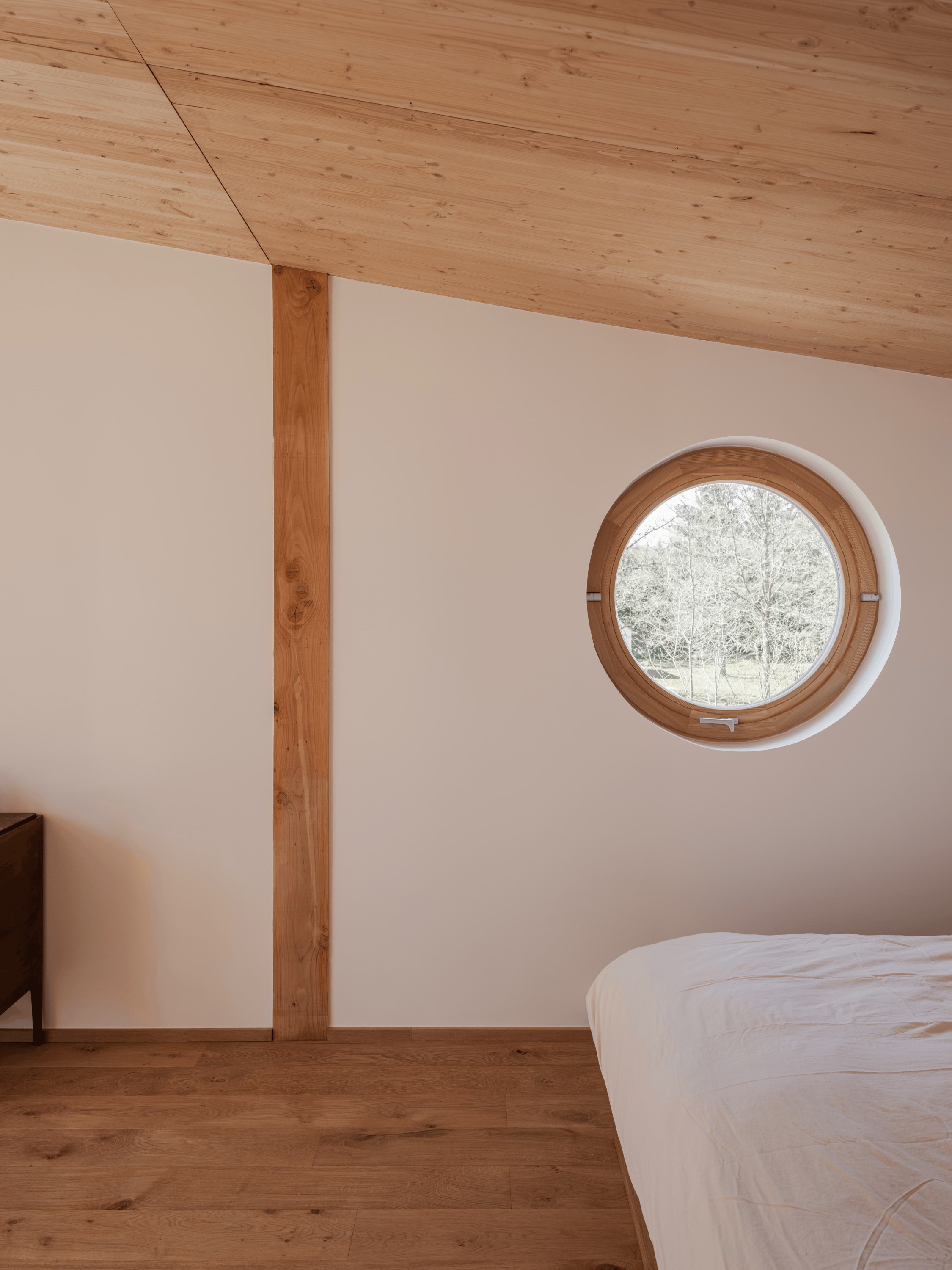 Lors de notre visite, nous avons eu l’occasion de visiter deux maisons, qui nous ont séduits par leur justesse architecturale. Quelques détails ont particulièrement retenu notre attention, comme le toit inversé qui permet la création d'une loggia baignée de soleil, les poutres en finitions qui se mêlent au béton ciré du sol, et les vues qui cadrent sur la forêt environnante.