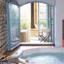 Le salon ouvre sur le balcon en bois. On est à Giverny, tout près de la maison de Monet, qui a inspiré au peintre James Finn les coloris de la pièce. L'architecte Philippe Robert les a conservés. Selon l'ardeur du soleil, la lumière change la couleur des murs. Le feu dans la cheminée, le kilim sur le sol, les canapés en vis-à-vis créent un cadre chaleureux.