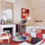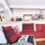 Dans l'entrée, un coin salon et un coin bureau dans un style campagne à la ville. Au sol, on a coulé une dalle debéton teinté beige mastic sur toute la surface. Par endroits, des lettres typographiques (Mille Feuilles) y sont incrustées. Sous le lit Directoire chiné et recouvert de boutis fleuris, des panières alignées qui servent de rangement. Le projecteur de cinéma a été trouvé à Cuba, et la chaise longue cannée chez l'antiquaire Loulou Les Ames Arts.