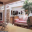 Au bout de la terrasse, un salon marocain aménagé dans une cabane existante et utilisé uniquement l'été, avec ses banquettes à même le sol et coussins rapportés de voyages.Le passage est bordé d'arbustes en pots : jasmin, bambous, camélias, pivoines...