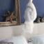La chambre en soupente, a un lit surmonté d'une moustiquaire accrochée sur une couronne en bois sculpté du XIXe ; au-dessus de la tête de lit, un cadre délavé piqué d'une étoile de sapin de Noël et une série de champignons en ciment brut. Face au lit recouvert d'un élégant lainage brut, Du long et du lé.