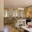 Association de meubles classiques aux façades moulurées laquées sur polymère, et îlot central en wengé, très contemporain ("Lago", Mobalpa).